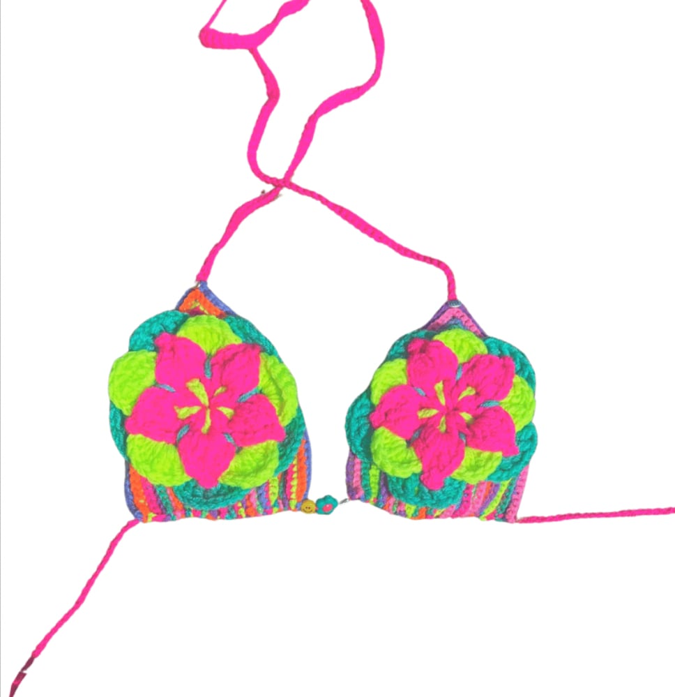 The Petal Chaos Top is a handmade crochet bikini top featuring oversized statement flowers on each cup. Bold, playful, and full of texture, it’s designed to stand out.