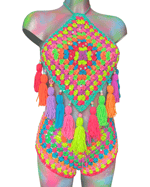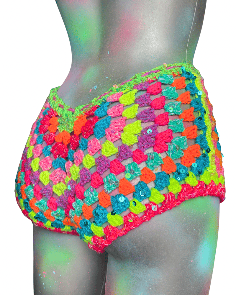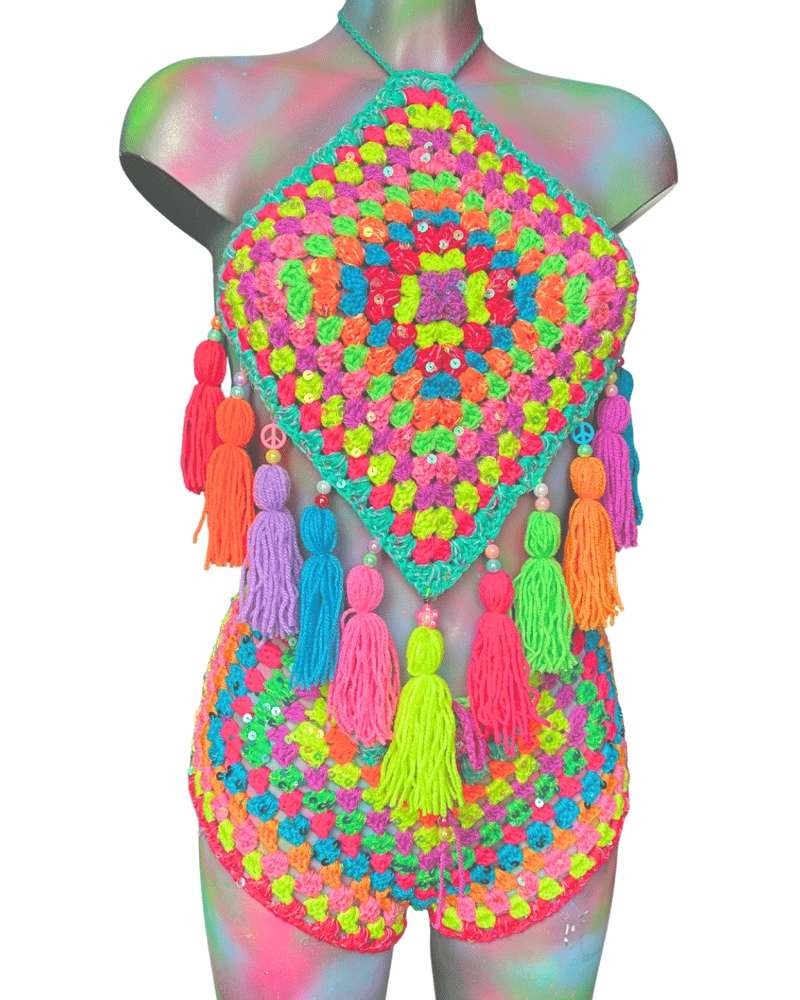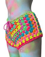The Rainbow Paradise shorts are designed to match perfectly with the halter top, made in the same colourful crochet style for a bold, summery look. They’re quite short for that cute, confident fit, but you can choose to have them slightly longer with two extra rows added at the bottom if you’d prefer a bit more coverage. They’re comfortable, eye-catching, and would be perfect for festivals, holidays, or styling up in warm weather, whether you wear them as a set or on their own.