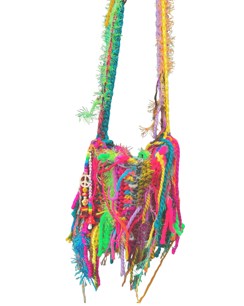 The Tassel Chaos Bag is a bold, textured statement piece covered in layers of hanging tassels and scrappy yarn details for that perfectly undone finish. Playful bead accents cascade from one side, adding extra movement and personality.