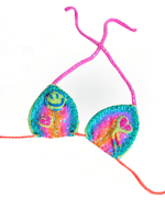 A handmade crochet bikini top bursting with colour and sparkle. Made using vibrant rainbow sequin yarn, this piece catches the light beautifully for a bold, playful look.